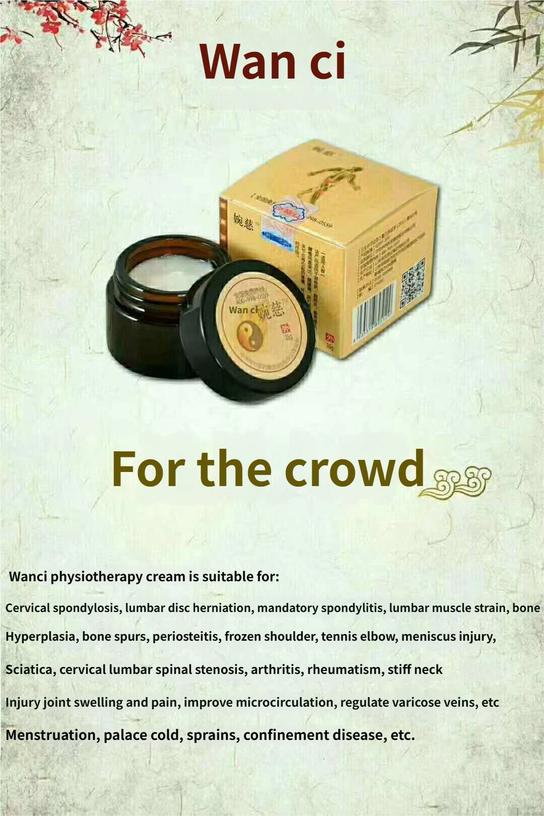 Wan Ci Therapeutic Balm, formulated with over 60 pure herbal extracts known for dispelling wind and cold, promoting blood circulation, and unblocking meridians. For external application to relieve neck, shoulder, waist, and leg pain caused by wind-cold and overuse. Note: The ointment’s texture, color, and scent may vary slightly with climate and season. Its efficacy stems partly from the herbal essential oil components, while the ointment base facilitates application. The scent serves to neutralize the pungent aroma of the herbs, providing a pleasant experience. Wan Ci’s century-old formula maintains consistent quality.