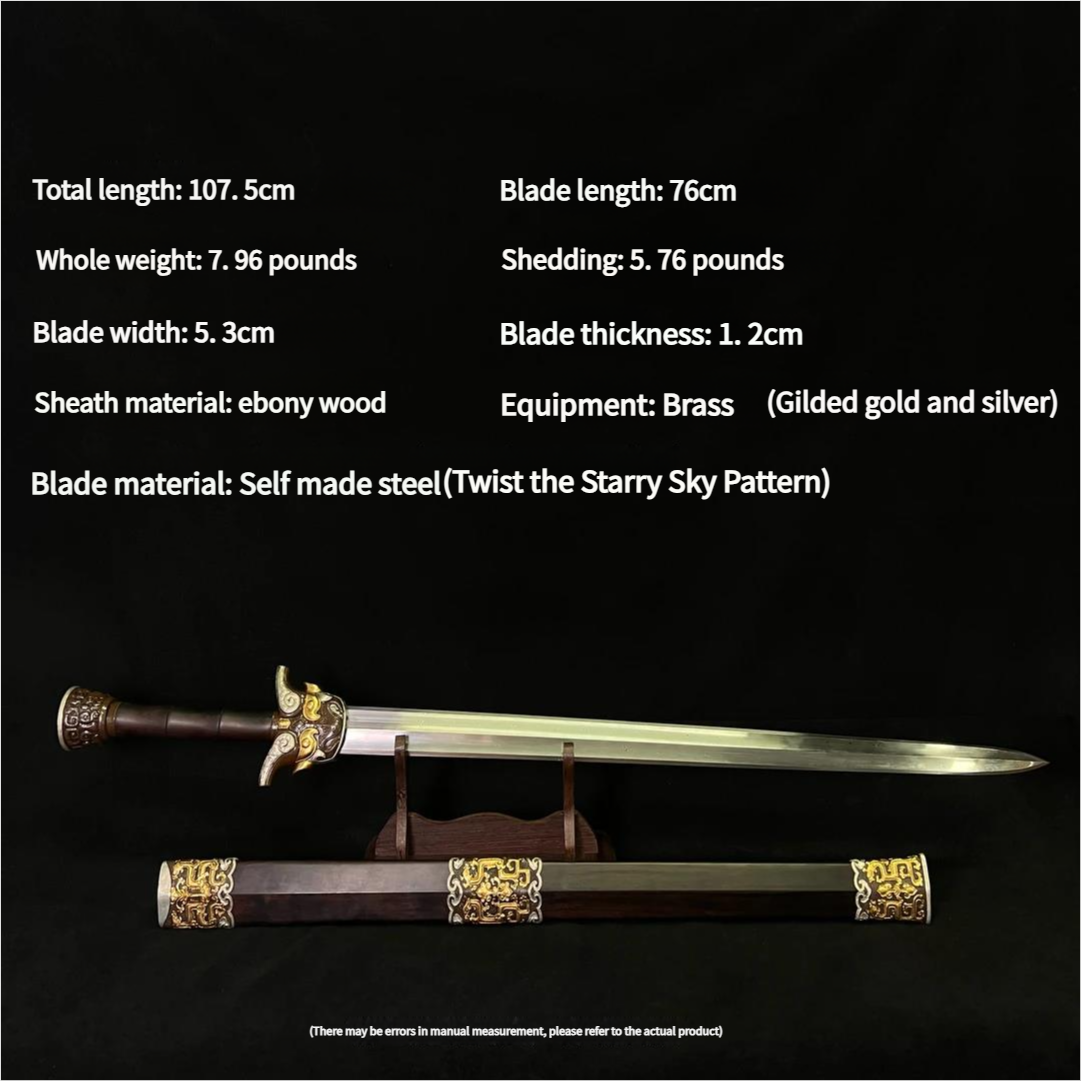 Longquan Sword Self-forged steel Ebony scabbard with brass fittings Gilded and silver-plated Hand-forged Unsharpened